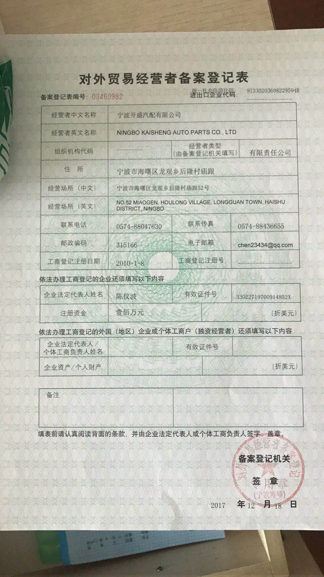 Export Company Name: Ningbo Kaisheng Auto Parts Co.,Ltd